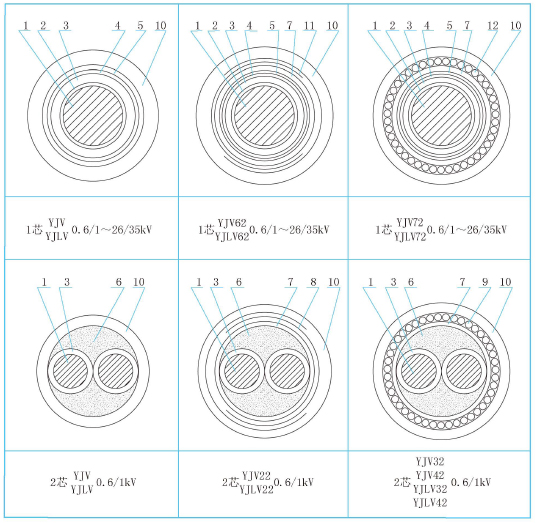 1:銅鋁導體 2:導體屏蔽 3:交聯聚乙烯絕緣 4:絕緣屏蔽 5:金屬屏蔽 6:填充